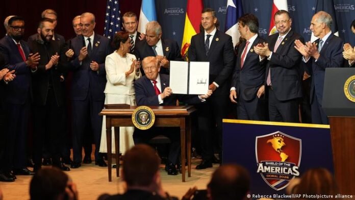 Muy contentos y acaramelados se los vio a los presidentes latinoamericanos con el presidente Donald Trump en la cumbre “Shield of the Americas” (Escudo de las Américas). Este acuerdo, que reúne a la mayoría de los países latinoamericanos, tiene como fin fortalecer la cooperación entre Estados Unidos y los países de América Latina para el combate del narcotráfico, el crimen organizado y también la migración irregular, a los que suele denominarse amenazas regionales.